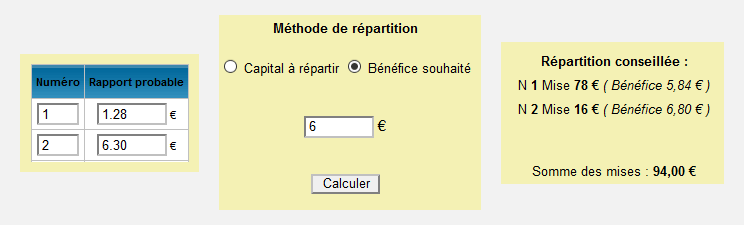 Il s'agit du Dutching. Le Dutching est une technique hors du commun, destinée au parieur véritable. Les paris Dutching décrits dans le chapitre 5 permet de doubler le Taux de réussite !